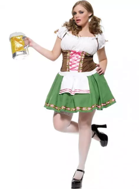 Inkluderer bondeoige kjole med snører foran og bagpå, der er også inkluderet et par matchende strømper med sløjfer på strømpebåndet