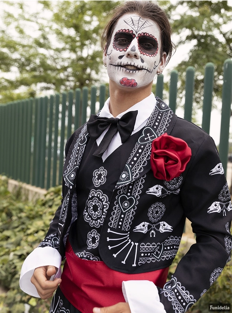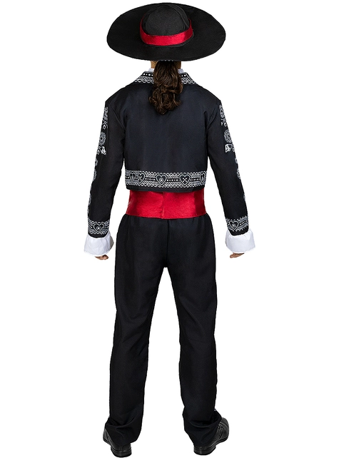 Dette Mariachi kostume til mænd inkluderer en jakke, t-shirt, sjal, bukser og hat, alt i sorte toner med hvide detaljer og rødt tilbehør. Afslut det med noget skræmmende Halloween make-up, og det bliver et De Dødes Dag Mariachi kostume.