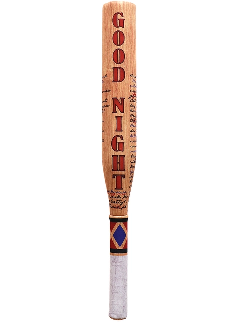 Fordi en psykopat som Harley ikke bærer en skurks typiske traditionelle våben. Harley’s bat er heller ikke et typisk baseball bat. Det er dekoreret i hendes egen stil med ordene “Good Night!” Indgraveret i det og et “originalt” digt, der ville få alles nakkehår til at rejse sig. På battets håndtag finder du også Harley Quinns karakteristiske Harlequin diamanter.