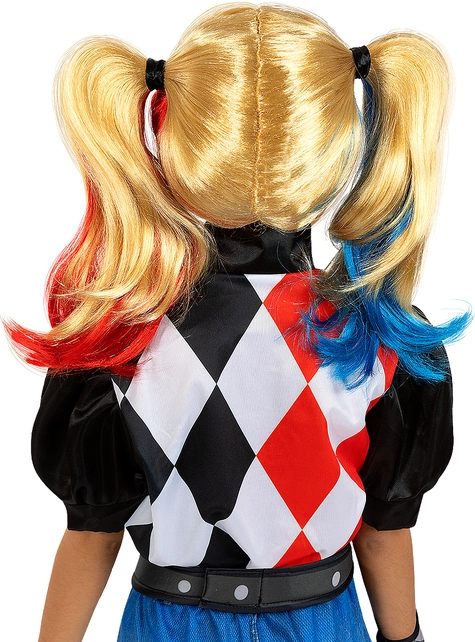 Hvis du vil blive Jokerens kæreste til din næste udklædningsfest, så fuldend dit kostume med denne Harley Quinn paryk til piger.