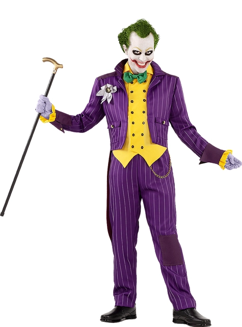 Hvis du har lyst til at få det samme look som denne videospilskurk, inkluderer dette kostume: en lilla dragt og frakke med hvide striber, en gul vest med knapper og en grønt butterfly. Og som et sidste touch til dit Joker look indeholder kostumet også en guldkæde, beregnet til at se ud som om du har et lommeur, og hvide handsker. Fordi du kan være elegant såvel som psyko.