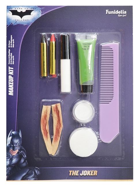 Med Joker make-up kan du få Joker’s uhyggelige og psykopatiske udseende. Sættet indeholder hvid vandbaseret make-up til hele dit ansigt, en sort farveblyant til at skitsere dine øjne, en rød farveblyant til at tegne det berømte Joker smil, grøn hårfarve, en kam og flydende latex til at lave dine egne ar.