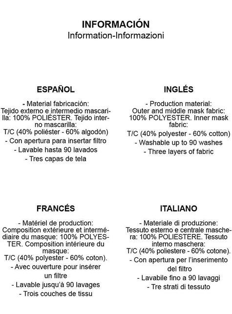 Inkluderet: Genanvendelig maske med tre lag stof og en åbning, der kan bruges til filtre. Op til 90 vaske. Vask forsigtigt i varmt vand. Opbevares på et rent, tørt sted eller i en forseglet pose, når den ikke er i brug. Ikke et medicinsk produkt eller personligt beskyttelsesudstyr.