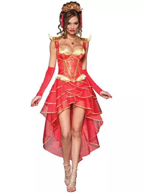 Inkluderet: kjole i silkesatin med gulddetalje, kappe med metallisk pynt og guldkrone med røde vedhæng