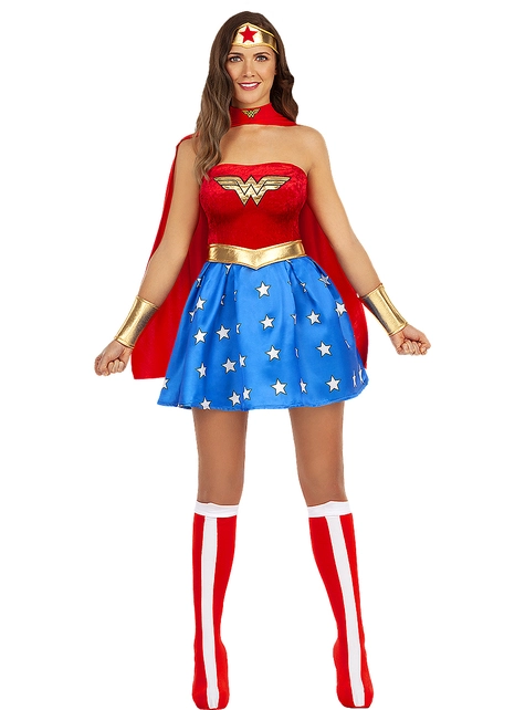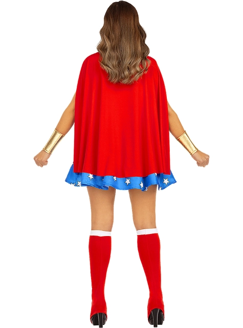 Vores sexede Wonder Woman kostume består af en stropløs kjole med en stram rød imiteret fløjls top, med Wonder Woman-symbolet broderet i guld, samt en kort blå nederdel med hvide stjerner. Det inkluderer også et bælte, armbånd, gyldent pandebånd og stramme røde og hvide støvledækker. Det der gør dette Wonder Woman kostume så eksklusivt, er den røde kappe.