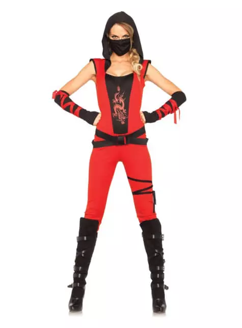 Inkluderer heldragt med hætte og dobbelt bælte, armvarmere med bånd, maske og sort bånd til benene